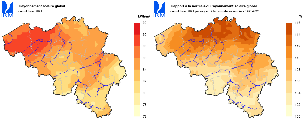 Sur l’hiver, très peu de jours sans soleil ont été observés à Uccle : 27 jours, pour une normale de 34,2 jours. Pour ce paramètre, l’hiver 2021 se classe à la cinquième position des valeurs les plus faibles, derrière 2014 (16 jours), 2005 (20 jours), 2016 (24 jours) et 2020 (25 jours).