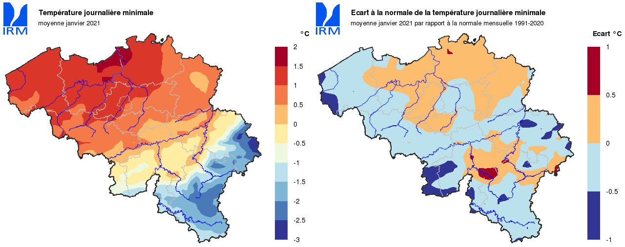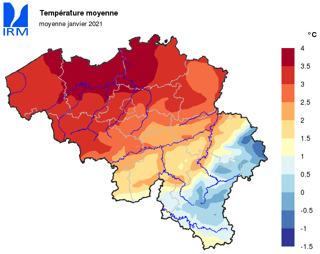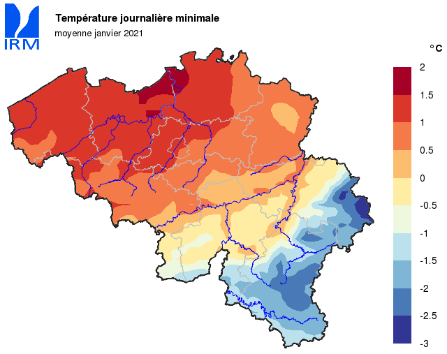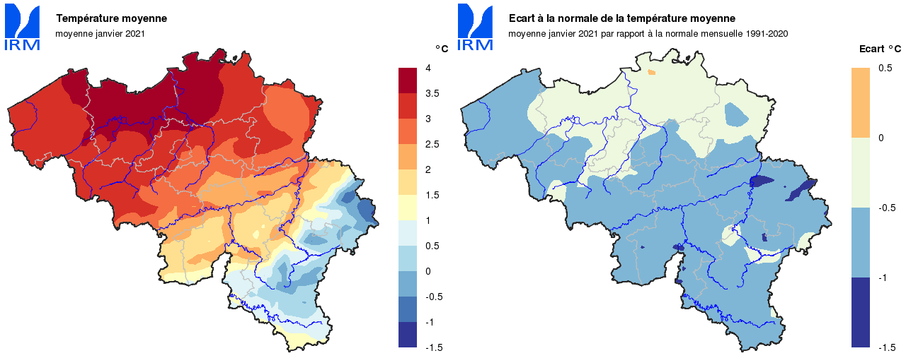 Durant la première partie du mois, les températures à Uccle ont été inférieures à leurs normales respectives. Ensuite, des périodes froides et plus douces se sont produites en alternance jusqu’à la fin du mois. Les brèves périodes de réchauffement n'ont pas empêché les températures moyennes de janvier de tomber sous les normales.