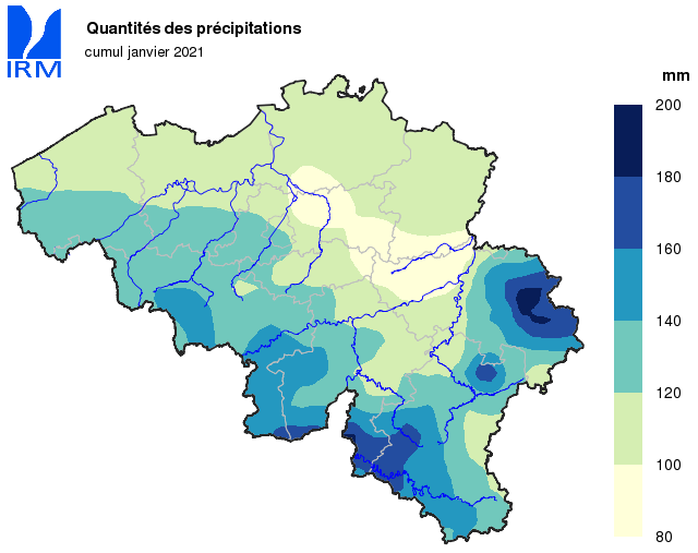 Au total, il est tombé à Uccle en ce mois de janvier un total de 131,3 mm de précipitations (norm.: 75,5 mm) en 23 jours (norm.: 18,9 jours). C’est le 4e mois le plus arrosé pour la période de référence actuelle, bien loin derrière le record de 2004 (153,8 mm).