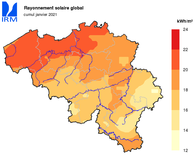 Le mois a commencé de manière maussade et pendant longtemps, il a semblé que le record de faible ensoleillement de 2018 (26h 59min) allait être battu. Cependant, vers la fin du mois, quelques jours un peu plus ensoleillés se sont produits, si bien que la durée d’insolation mensuelle a atteint 27h 17min à Uccle (normale : 59h 04min). Dès lors, janvier 2021 se place en deuxième place des mois de janviers les plus sombres pour la période de référence actuelle.