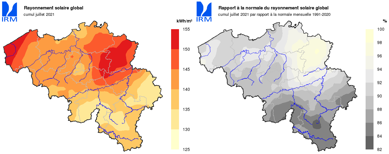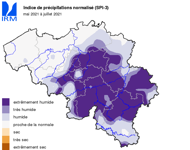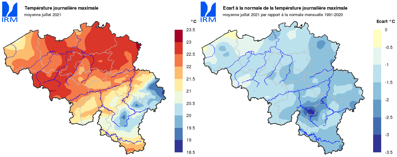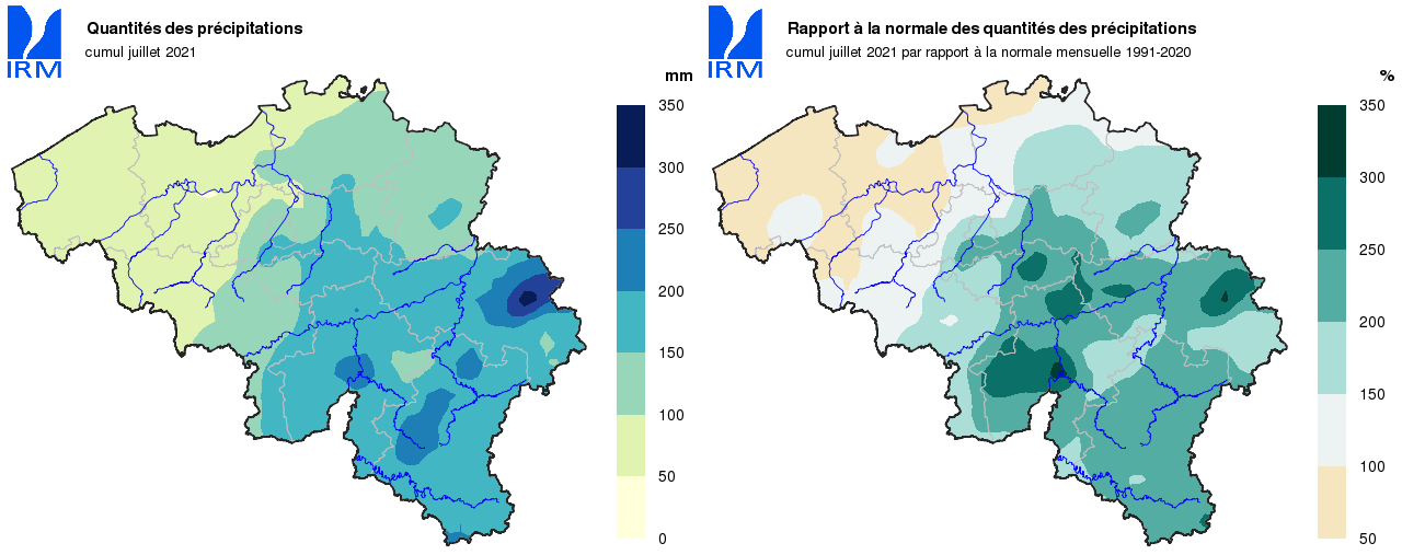Les grandes quantités de précipitations tombées en milieu de mois ont entraîné de nombreuses inondations avec, malheureusement, un bilan humain très lourd, puisqu’une quarantaine de personnes ont perdu la vie. Les provinces de Liège, Namur et Luxembourg ont été particulièrement touchées et seul l'ouest du pays a été épargné. On trouvera plus d'informations sur cet événement via le lien suivant : https://www.meteo.be/fr/infos/actualite/ce-que-lon-sait-sur-les-pluies-exceptionnelles-des-14-et-15-juillet-2021