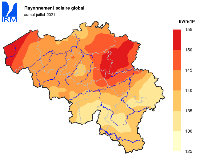 A Uccle, le soleil n'a brillé que 171h 03min sur l’ensemble du mois (normale : 203h 14min). Plus tôt cette année, les mois d’avril (198h 38min) et juin (201h 34min) avaient été tous plus ensoleillés que ce deuxième mois d'été.