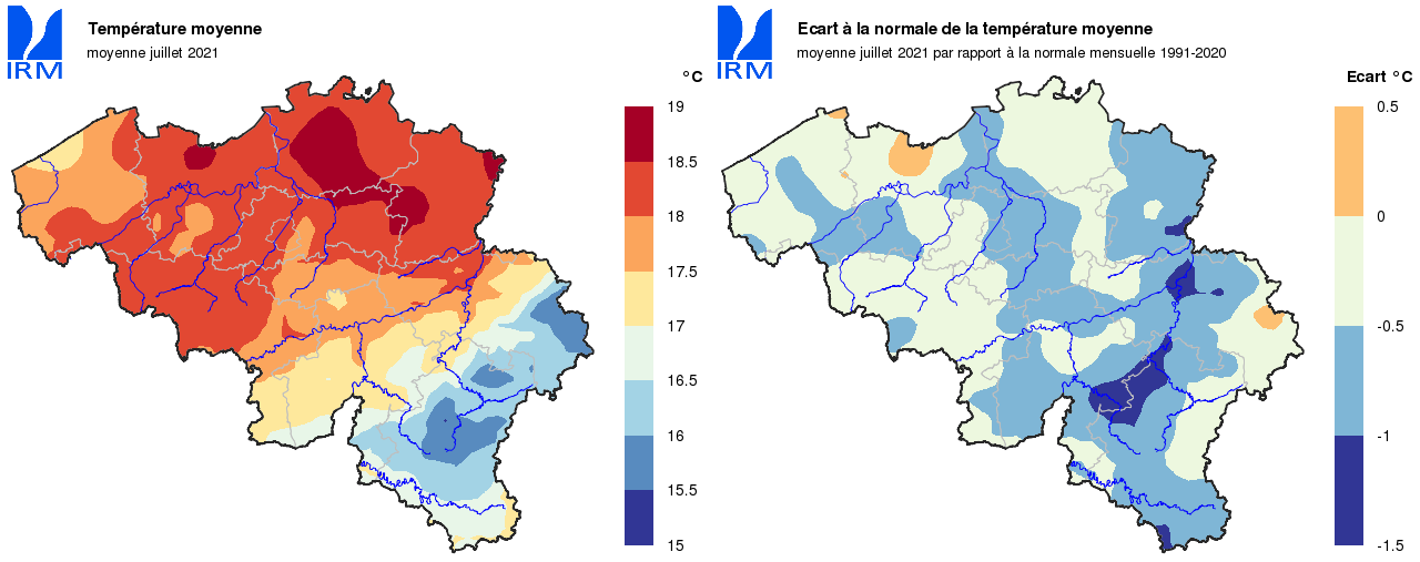 Avec de telles températures, il n'est pas surprenant que la température moyenne à Uccle ait été inférieure à la normale : 17,9°C (normale : 18,7°C). Seule la température minimale moyenne a été légèrement supérieure à sa normale mensuelle (14,3°C, par rapport à la normale de 14,1°C).