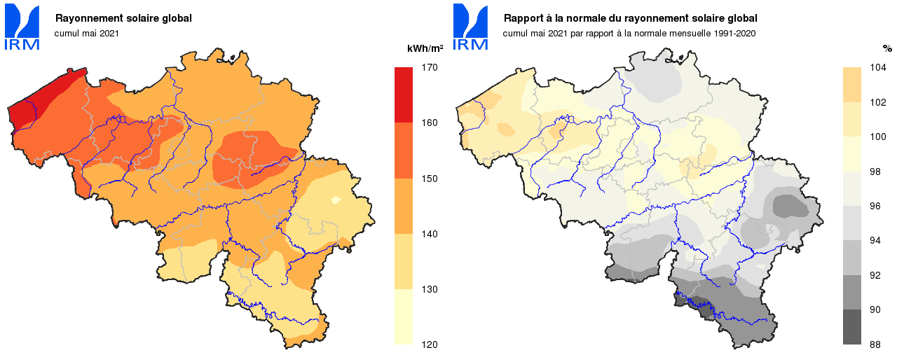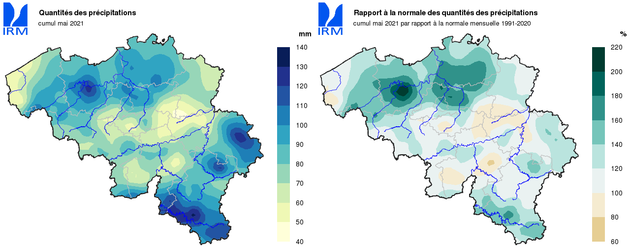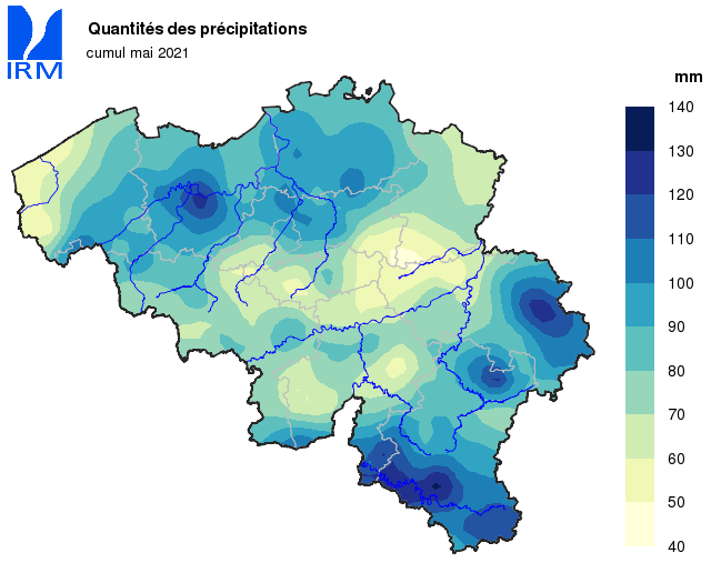 Il est tombé à Uccle un total mensuel de 85,8 mm d’eau (normale : 59,7 mm) en pas moins de 22 jours, soit un nombre équivalent au record de 2007 (normale :13,1 jours). La plus grande partie de cette quantité est tombée lors de la deuxième décade (11-20 mai). Il est tombé durant cette décade jusqu’à 40,7 mm de pluie, autant qu’en 2000 mais tout de même un peu moins qu’en 2007 : il était alors tombé 64,0 mm en 10 jours.
