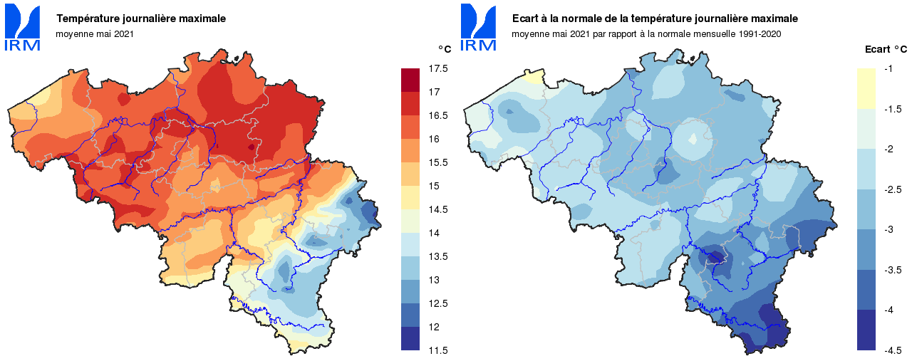 Le mois de mai a poursuivi la tendance du mois d'avril. Les premiers jours du mois ont connu des températures bien inférieures aux valeurs normales. Le 9 sembla marquer un tournant avec un maximum de 25,6°C. Toutefois, ce fut le seul jour d'été [max>=25°C] au cours du mois. Même les jours de printemps [max>=20°C] se sont fait rares. Ce n'est qu'à la fin du mois que de telles températures furent à nouveau atteintes.