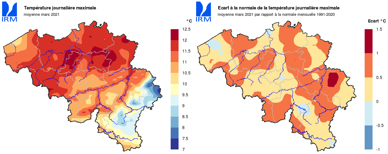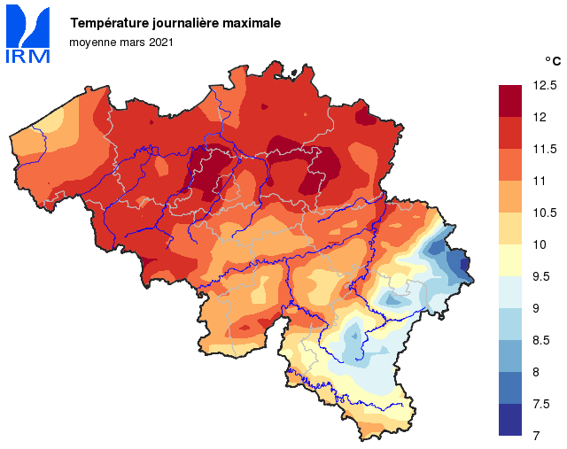 Dans le pays, la température la plus élevée a été enregistrée le 31. Le dernier jour du mois, la température est montée jusqu’à 26,8°C à Koersel (Beringen). Depuis 1954, il s'agit de la température la plus élevée enregistrée durant un mois de mars dans le réseau climatologique belge (précédent record : 25,8°C le 29 mars 1968 à Angleur (Liège)).