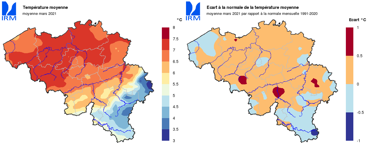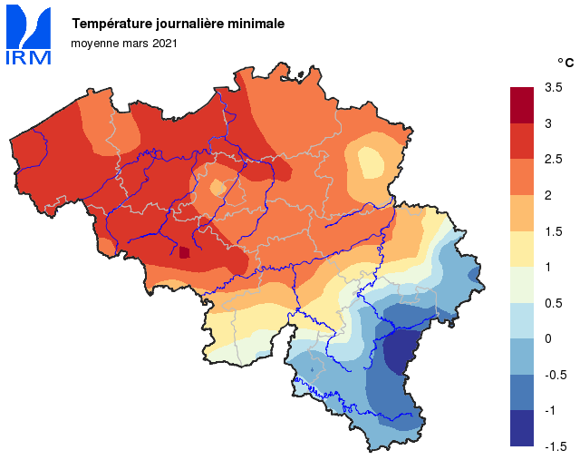 À Uccle, au cours du mois, les températures ont varié entre -2,7°C (le 6 mars) et 23,9°C (les 30 et 31 mars). On a enregistré 3 jours de gel [min<0°C] (norm.: 5,0 jours) et déjà, comme en 1998, 2004 et 2017, 2 jours de printemps [max>=20°C] (norm: 0,5 jour). Ce n'est qu'en 2014 (5 jours) et 2012 (3 jours) que l'on avait relevé encore davantage de jours de printemps en mars.