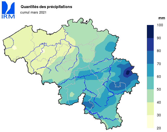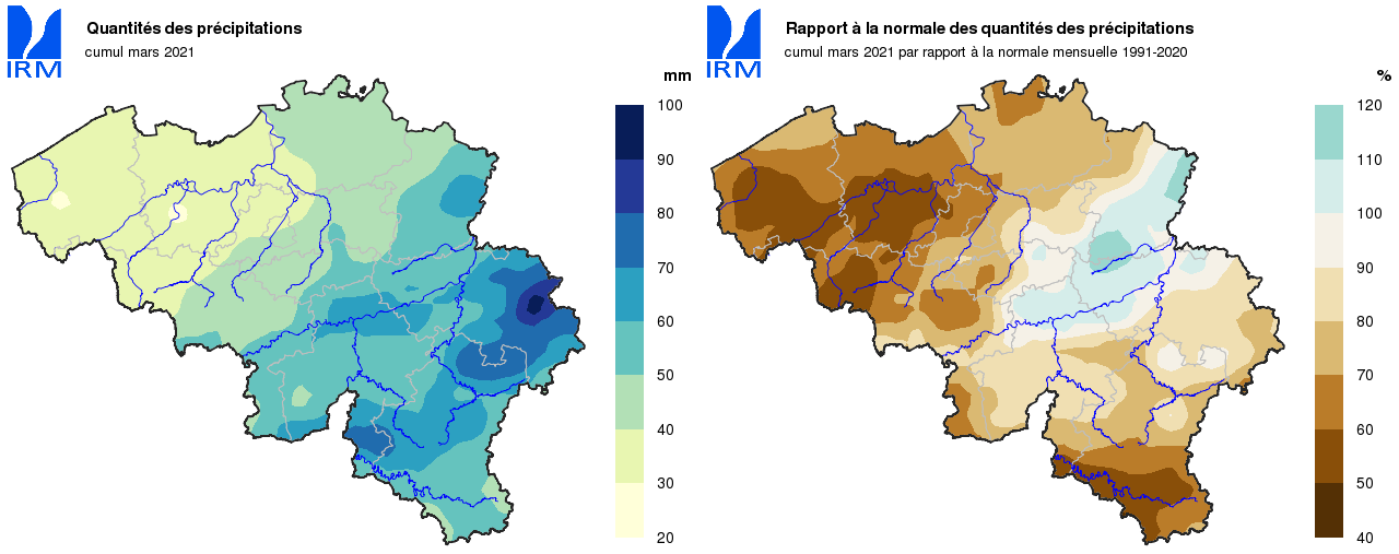Les quantités régionales moyennes de précipitations mensuelles ont été dans le pays presque partout inférieures aux valeurs normales. Elles ont varié entre environ 60% de la normale dans les Flandres et le Tournaisis et environ 105% de la normale en Hesbaye.