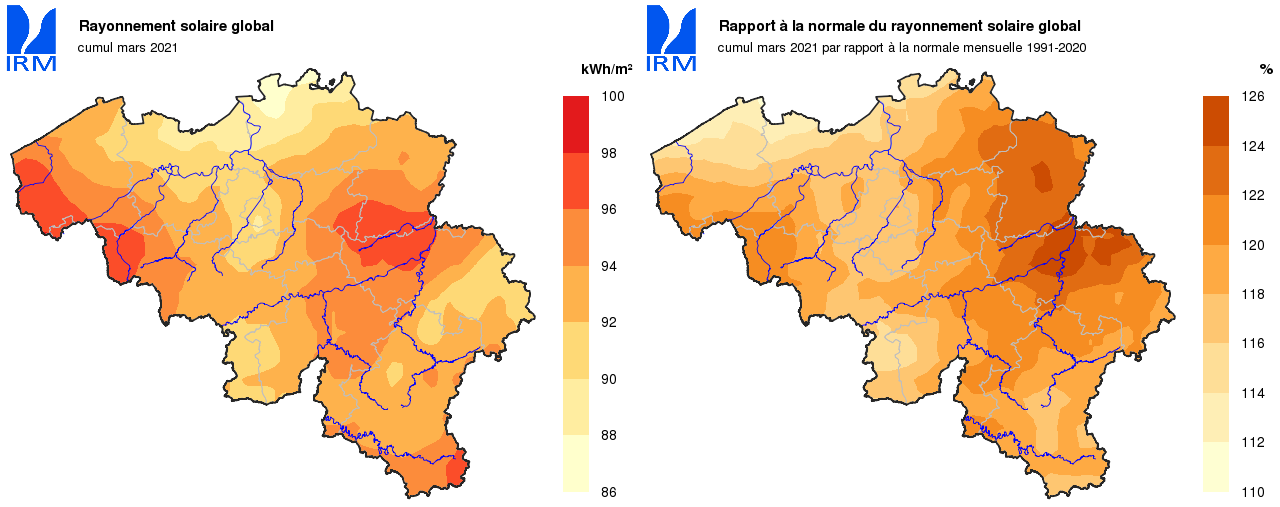 C’est surtout au début et en fin de mois que le soleil a été particulièrement généreux. A Uccle, sur l’ensemble du mois, la durée d’insolation a atteint 166h 36min (norm: 125h 45min).