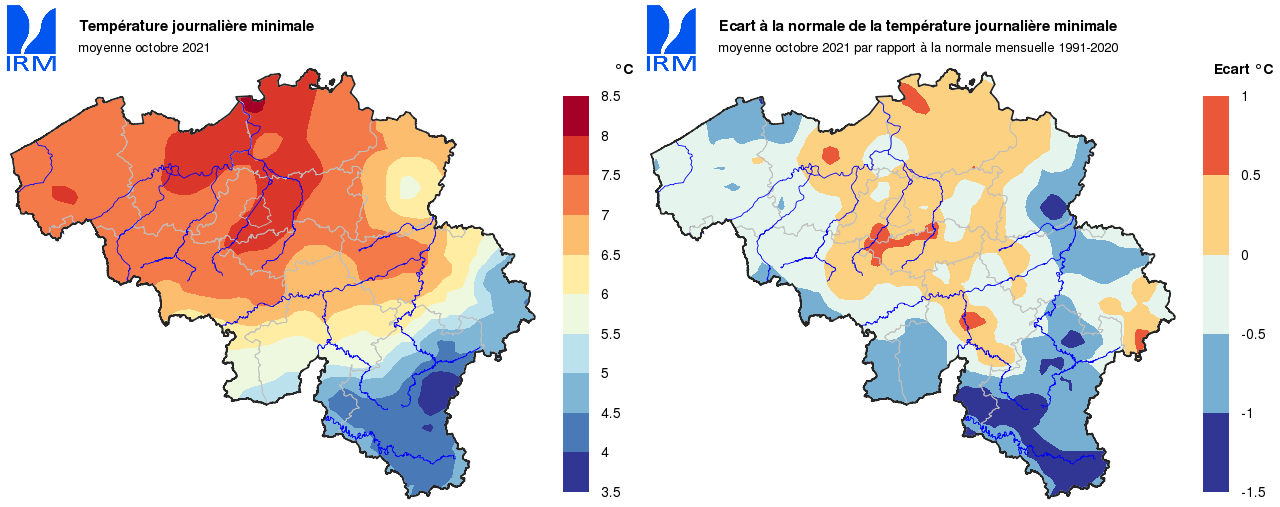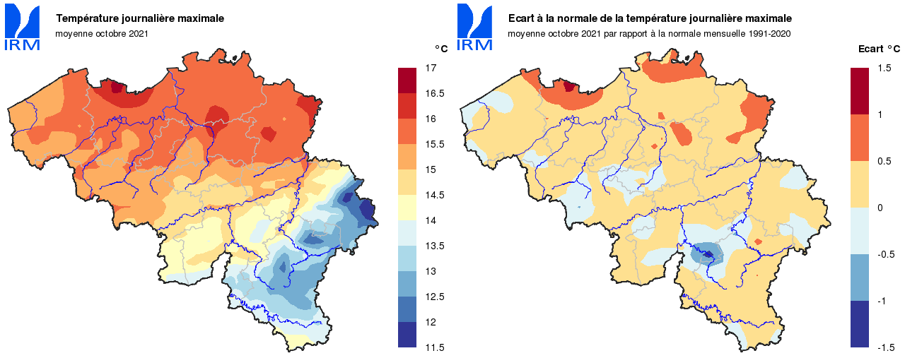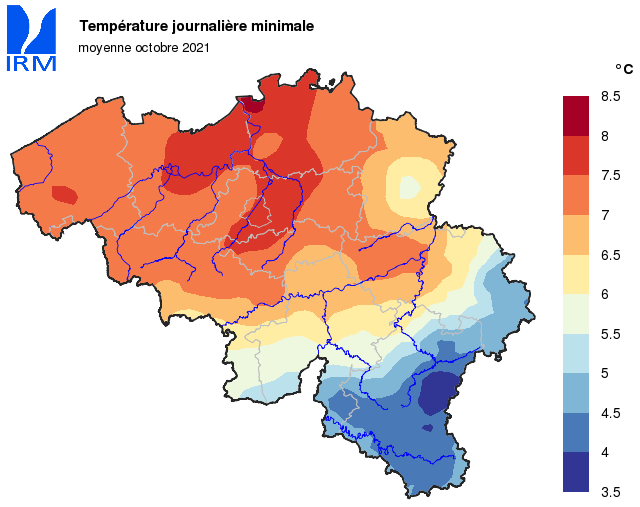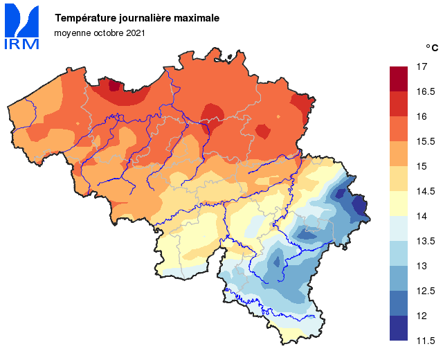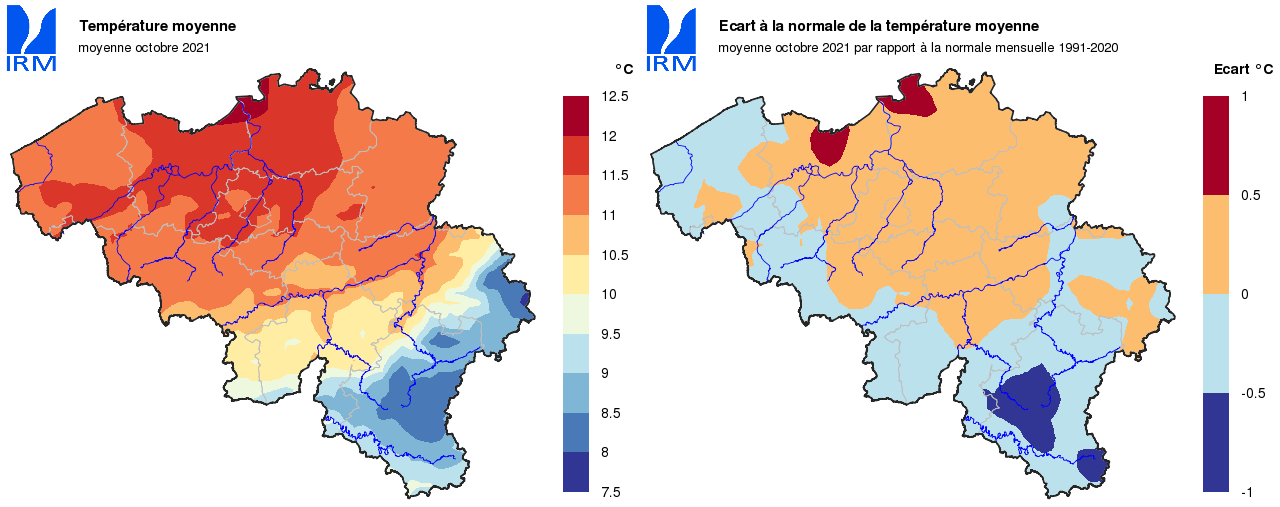 A Uccle, les températures ont varié entre 4,2°C (21 octobre) et 18,9°C (19 octobre). Il s'agit de la température maximale absolue la plus basse pour un mois d’octobre depuis 2003 (18,3°C). Autre fait remarquable : depuis 2003, c’est seulement la quatrième fois que cette valeur est inférieure à 20°C. Les autres années ont été 2007 (19,3°C), 2009 et 2016 (19,9°C chacune).