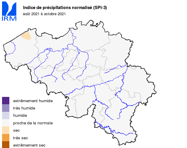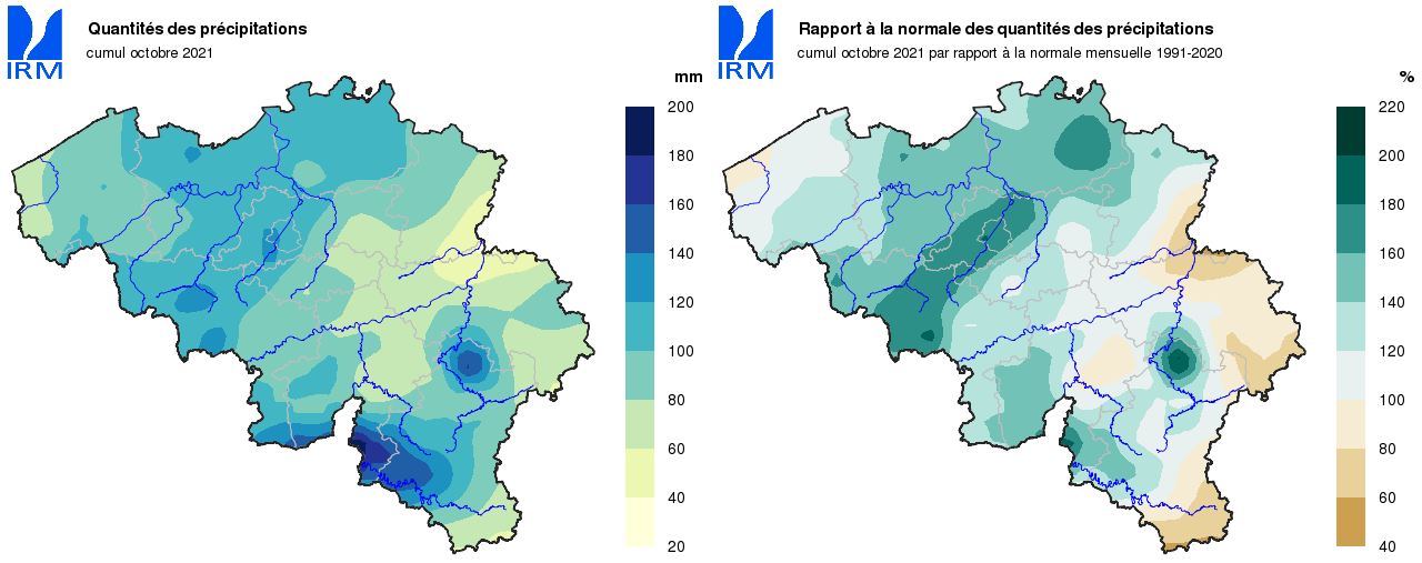Les moyennes régionales des quantités de précipitations mensuelles dans le pays ont été proches des normales. Elles ont varié d'environ 70% de la normale en Lorraine belge à environ 155% de la normale dans le Tournaisis.
