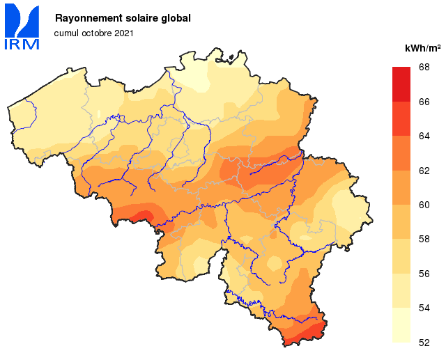 En octobre, aucun jour de gel [min<0°C] (normale : 0,4 jour) ni aucun jour de printemps [max>=20°C] (normale : 2,8 jours) n’ont été enregistrés à Uccle.