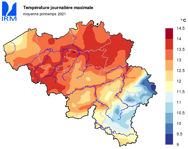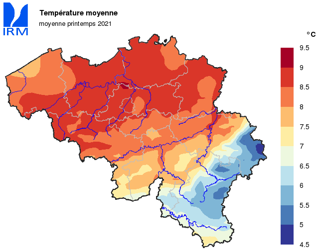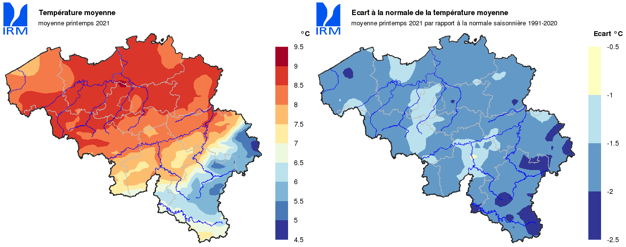 À Uccle, le mois de mars a été le seul mois du printemps avec une température moyenne supérieure à sa valeur normale, en partie grâce à deux journées particulièrement chaudes. Cependant, le mois d'avril le plus froid depuis 1986 et les basses températures du mois de mai ont conduit à un printemps globalement beaucoup plus froid qu’en moyenne (8,8°C, normale : 10,5°C).