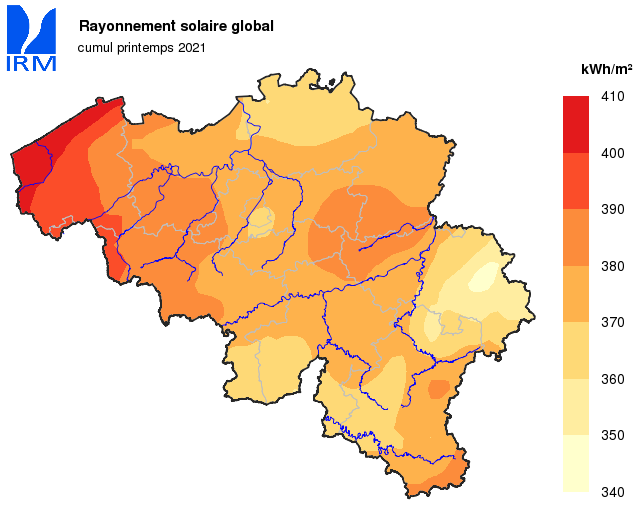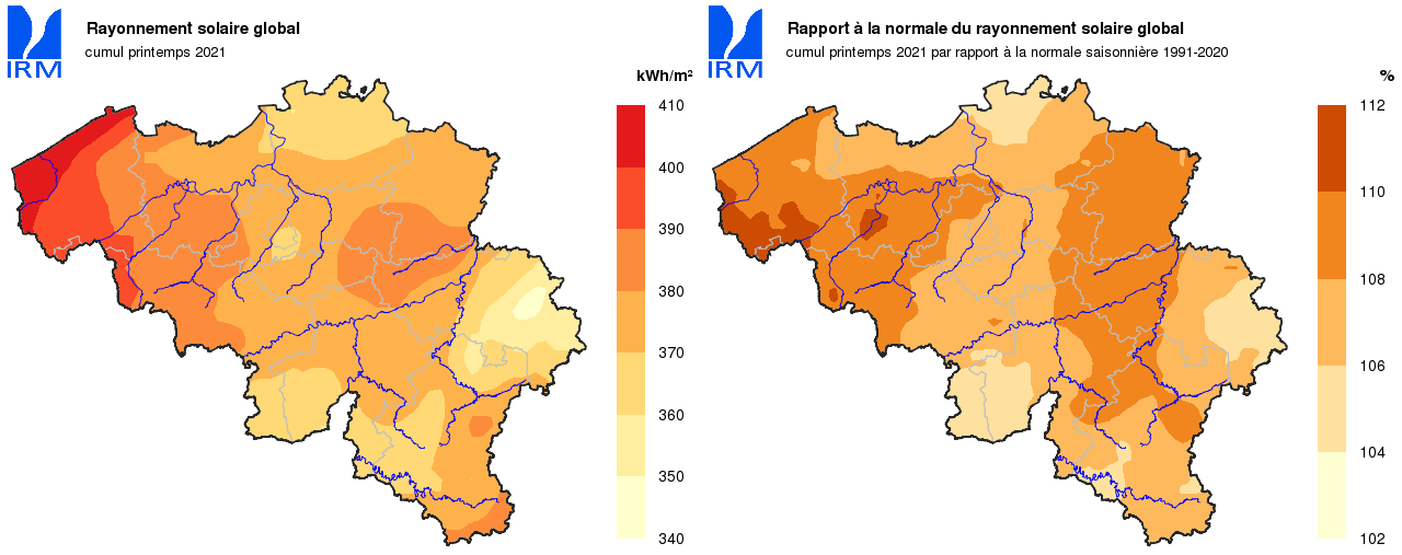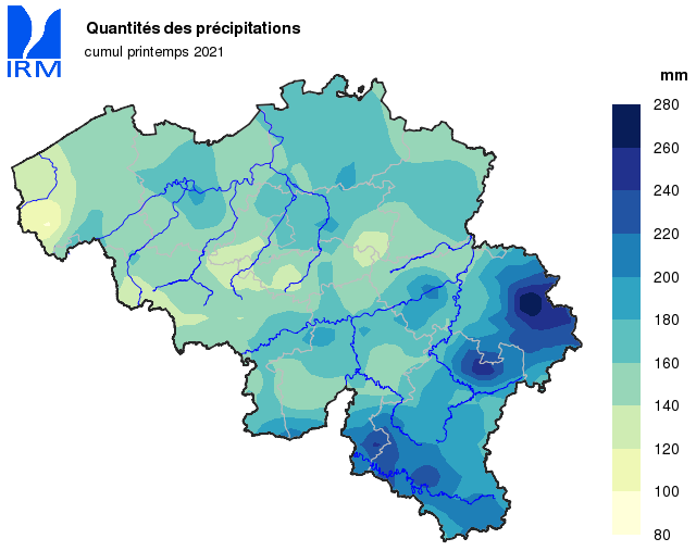 À Uccle, les mois de mars et surtout avril ont été plus secs qu’en moyenne, tandis que le mois de mai a été beaucoup plus humide. Du 13 au 28 avril, il ne tomba aucune précipitation, tandis qu’au cours du reste de la saison, on eut droit à des averses régulières. Au final, le cumul saisonnier de précipitations est juste égal à sa valeur normale : 165,6 mm.
