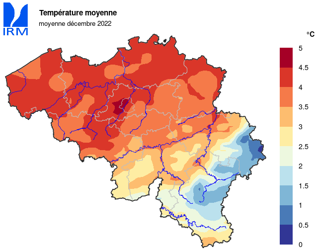 Du fait de cette longue période plus froide, la température moyenne finale à Uccle a été inférieure à la normale pour la première fois depuis 2010 : 4,2 °C (normale : 4,3 °C). Une fin du mois relativement chaude a permis de limiter l’écart à la normale.