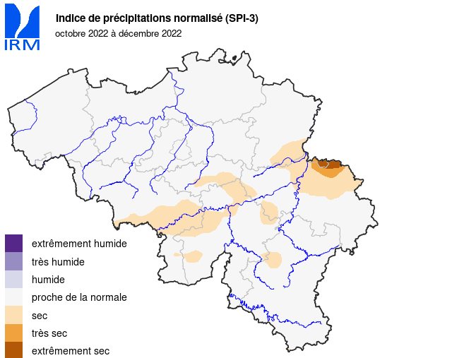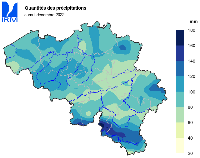 Les quantités moyennes mensuelles de précipitations dans les différentes régions de notre pays étaient en dessous de la normale presque partout. Elles ont varié d'environ 60 % de la normale en Lorraine belge à environ 115 % de la normale à Tournai.