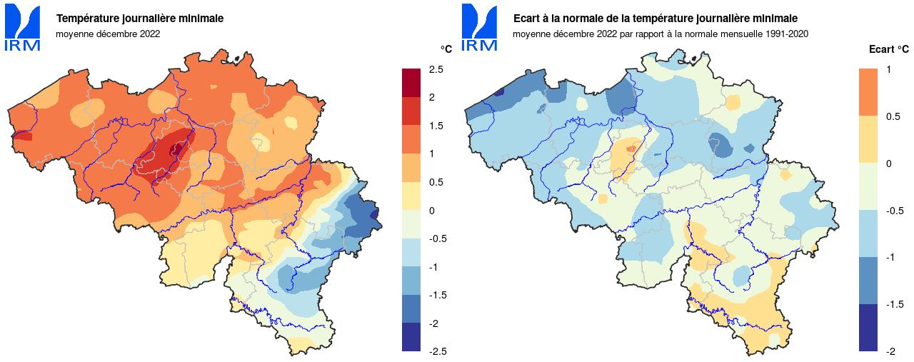 A Uccle, les températures ont oscillé entre -6,8°C (le 18 décembre) et 16,3 °C (le 31 décembre), un nouveau record historique pour la troisième décade de décembre (21-31 décembre). Le précédent record de température maximale la plus élevée remontait à 1977 et était de 14,8°C (mesures depuis 1892).