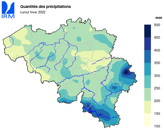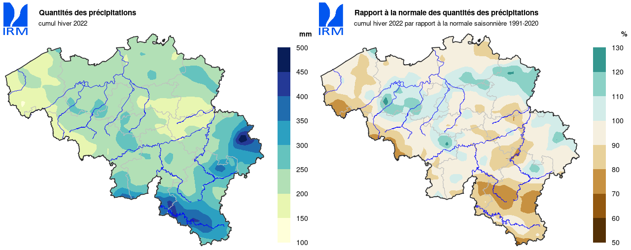 Les quantités régionales moyennes de précipitations ont oscillé autour des valeurs normales et ont varié d’environ 85% de la normale au littoral à environ 135% de la normale dans la région de la Gileppe et de la Warche.
