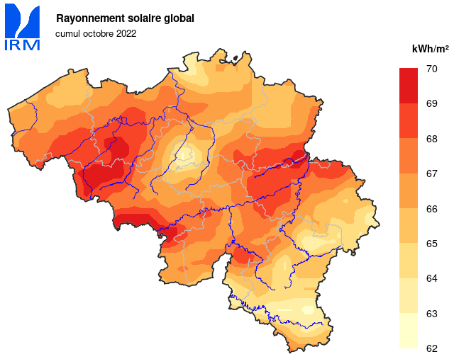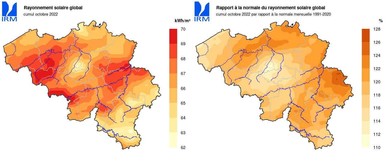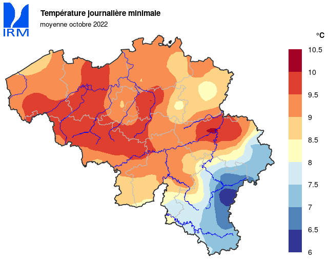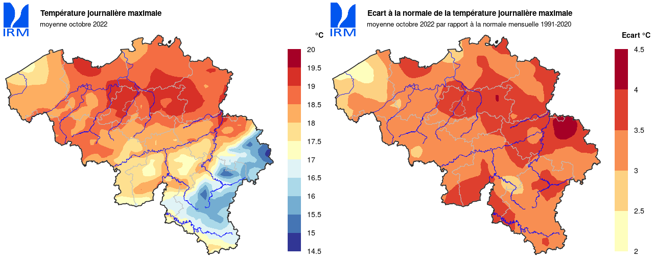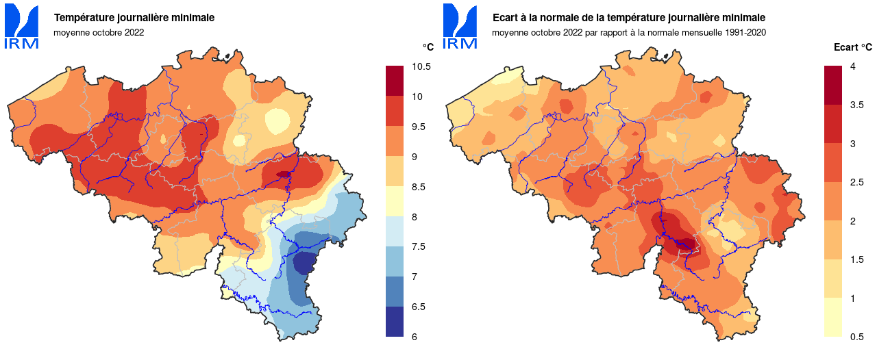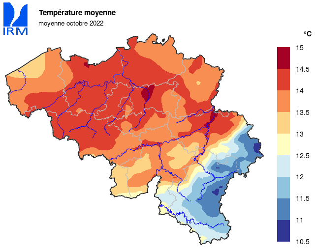 Sur l’ensemble du pays, l’extrême minimal des températures a été relevé le 12 Octobre à Elsenborn (Butgenbach) avec une valeur de -3,6°C. L’extrême maximal a été relevé le 29 octobre à Dilbeek et Meeuwen (Oudsbergen) avec une valeur de 25,6°C.