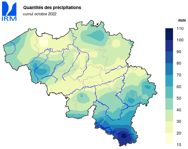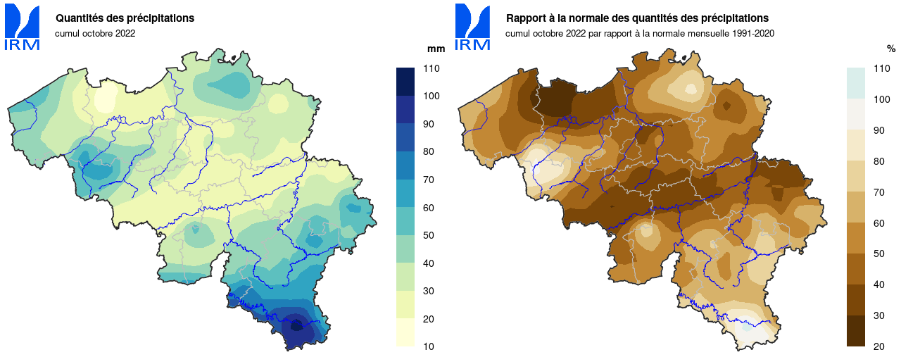 Après un premier mois d'automne humide, le mois dernier a de nouveau enregistré des précipitations inférieures à la normale. A Uccle, un total de 40,7 mm de précipitation est tombé (normale : 67,8 mm). Ce total est tombé sur 13 jours (normale : 16,1 jours). Il s'agit du troisième mois d'octobre le plus sec de la période de référence actuelle. Le record reste de 6,0 mm en 1995.