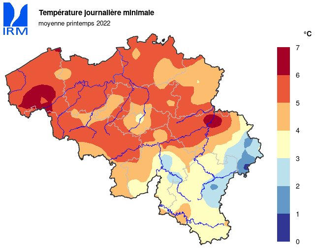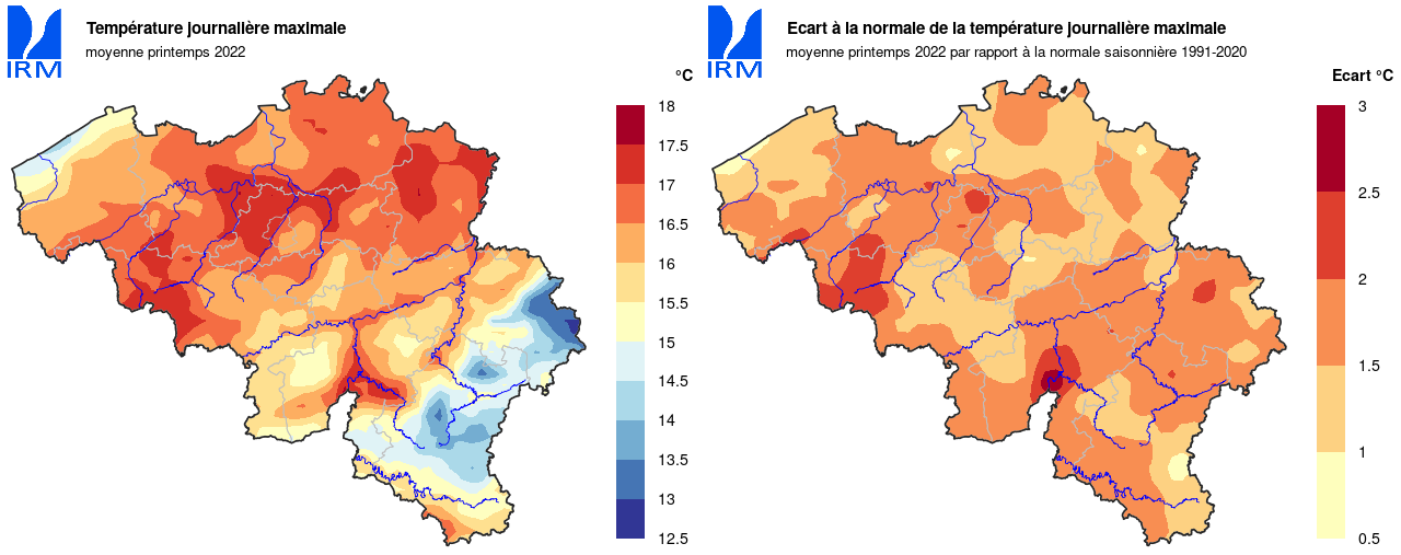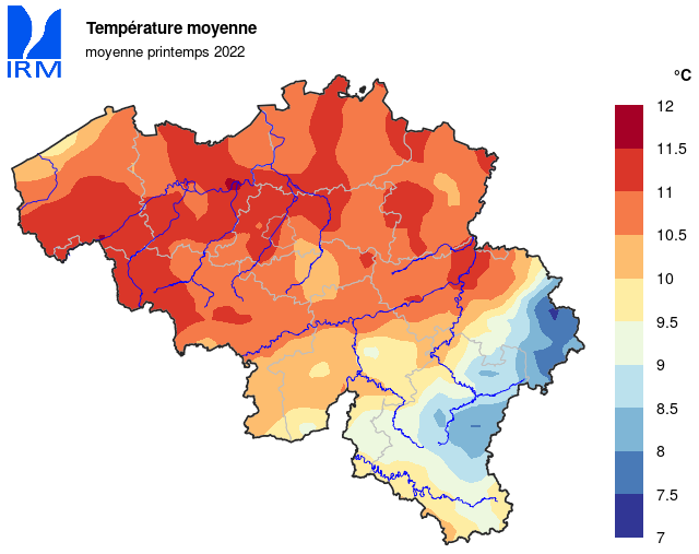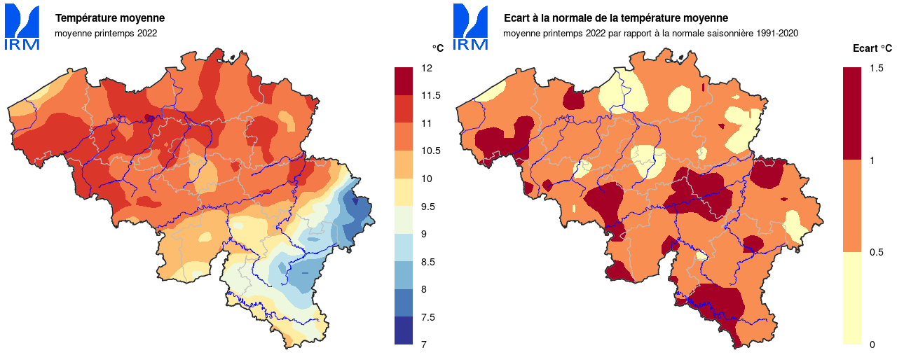 À Uccle, le mois d'avril a été plus froid que la moyenne, tandis que les mois de mars et mai ont été plus chauds. Le printemps dans son ensemble a également été plus chaud que la moyenne : 11,3°C (normale : 10,5°C).