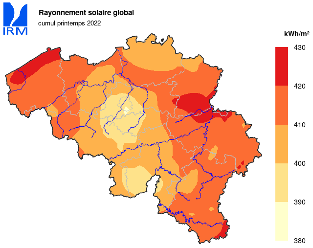 | Rayonnement solaire global | kWh/m² | 386.6 | 343.6 | ++ | 436.4 | 2020 | 291 | 1998 |