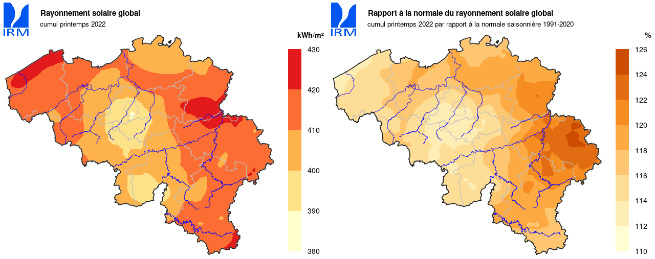 Les trois mois de printemps à Uccle ont tous été plus ensoleillés que la moyenne. En mars, nous avons même atteint un nouveau record absolu. Le printemps a donc été également très ensoleillé : 674h 27min (normal : 495h 19min). Cela en fait le troisième printemps le plus ensoleillé de la période de référence actuelle, loin derrière le record établi en 2020 (740h 48min) et derrière 2011 (707h 16min).