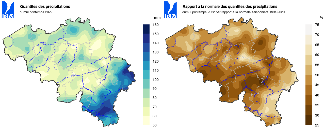 En mars, il n'est tombé que 2,2 mm de précipitations à Uccle - ce qui constitue un nouveau record absolu - et avril a également été plus sec que la moyenne. La fin du mois de mai ayant été humide, ce printemps n'est pas tout à fait entré dans le top 5 des printemps les plus secs (septième place, loin derrière le record de 2011 avec 70,7 mm de précipitations). A Uccle, il est finalement tombé 108,8 mm de précipitations (normale : 165,6 mm).