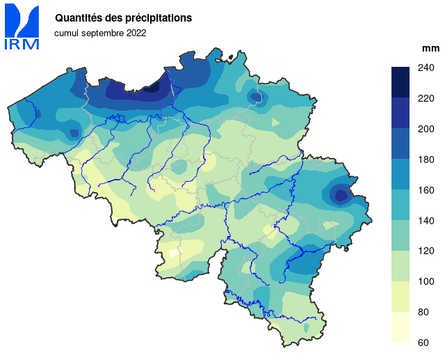 Après un été extrêmement sec, il est tombé durant ce premier mois automnal plus de précipitations que la normale. A Uccle, il est tombé un total de 104.8 mm de précipitations (normale : 65,3 mm). Cette quantité est tombée en 20 jours (normale: 14,1 jours). Bien qu’il s’agisse du cinquième mois de septembre le plus pluvieux de l’actuelle période de référence, le record absolu de 2001 n’a jamais été approché (199,4 mm).