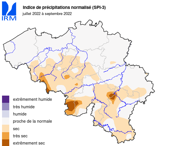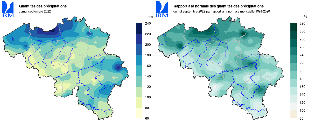 Dans notre pays, c’est en Lorraine belge que les précipitations les moins importantes ont été relevées (environ 135% de la normale) tandis que les précipitations les plus importantes sont tombées dans les Polders (environ 230% de la normale). Ce n’est que très localement qu’il est tombé un peu moins de précipitations que la normale.