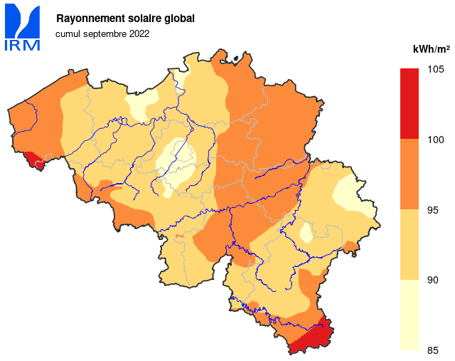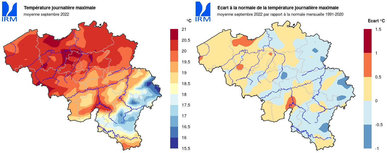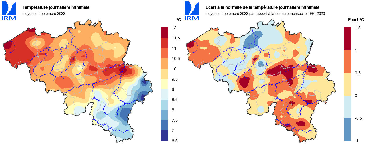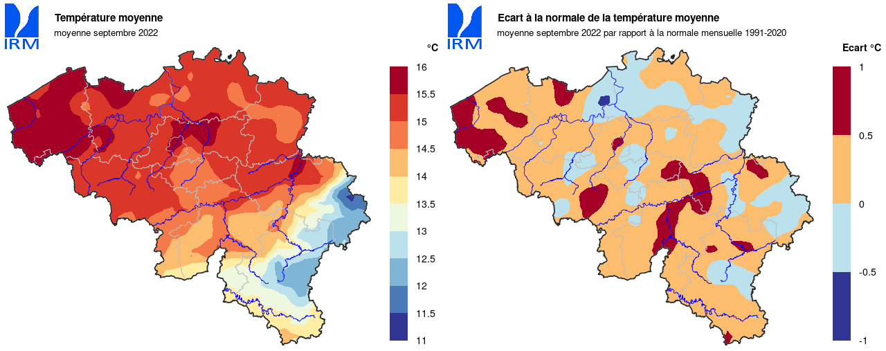 Le 30 septembre, la température minimale est descendue jusqu’à -2,7°C à Elsenborn (Bütgenbach). La température la plus élevée a de nouveau été mesurée à Kapelle-op-den-Bos et a atteint 32,3°C (5 septembre).