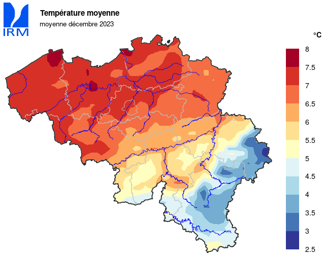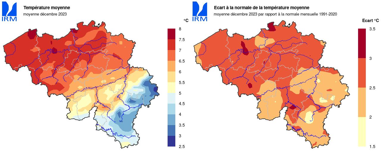 Au final, la température moyenne de ce dernier mois a été nettement supérieure à la normale à Uccle : 7,0°C (normale : 4,3°C). Il s'agit du deuxième mois de décembre le plus chaud pour la période de référence actuelle, bien que très loin du record de 2015 (9,6°C).
