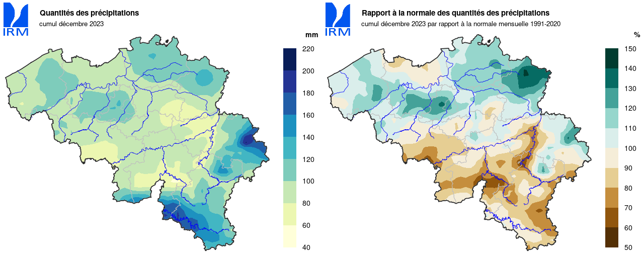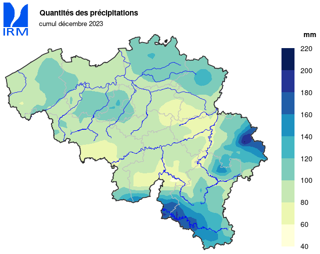 Dans le reste du pays, les précipitations les plus importantes sont tombées le 4 décembre. Ce jour-là, à Sugny (Vresse-sur-Semois), une quantité de 31,5 mm a été enregistrée.