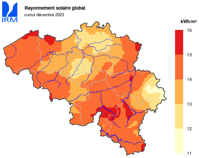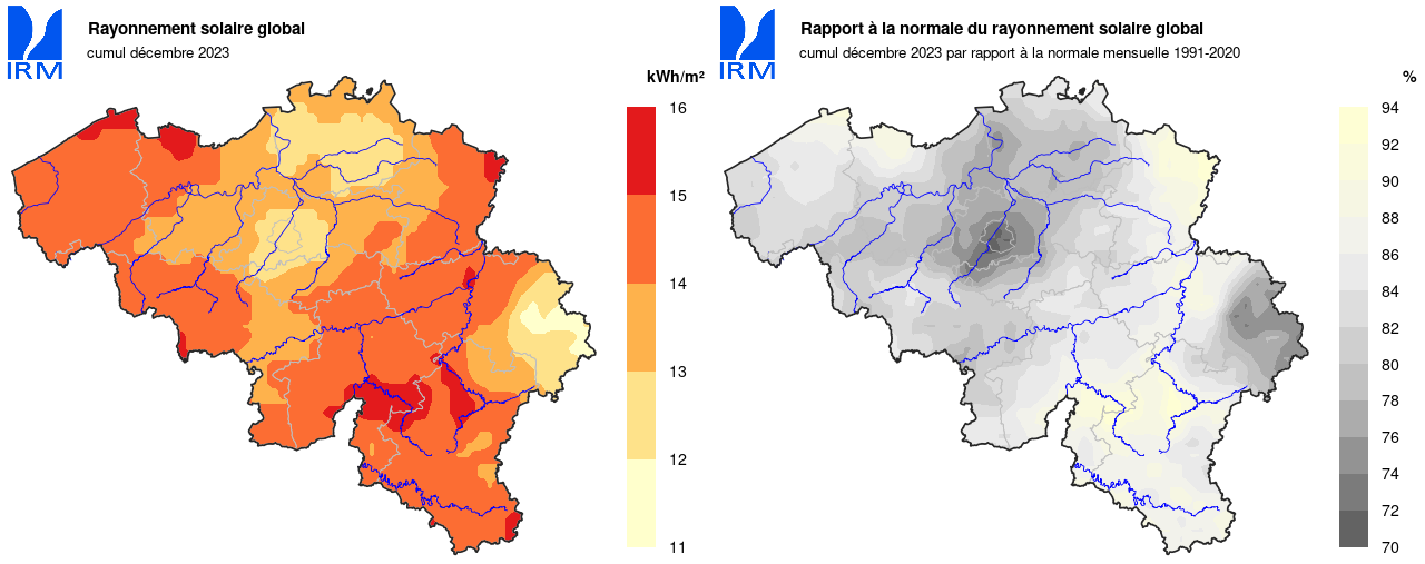 À Uccle, le soleil n'a brillé que pendant 19h 59min (normale : 48h 35min). Il s'agit du troisième mois de décembre le plus sombre pour la période de référence actuelle. Il n'y a qu'en 2017 (10h 29min) et 1993 (16h 17min) que le soleil était moins présent dans le ciel.