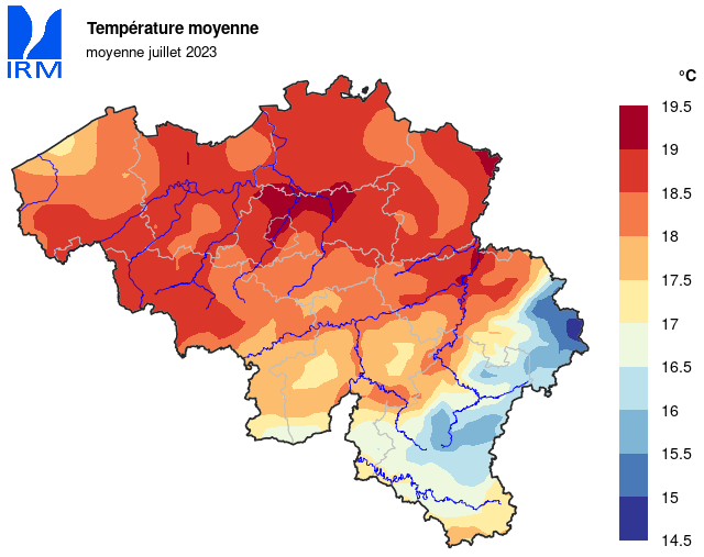 A l'exception d'une période plus chaude du 7 au 15 juillet, les températures minimales et maximales à Uccle ont été inférieures aux valeurs normales respectives pendant presque tout le mois. Néanmoins, respectivement, leurs moyennes mensuelles ont été à peine inférieures à leurs normales. Le mois dernier, la température moyenne était de 18,4°C (normale : 18,7°C).