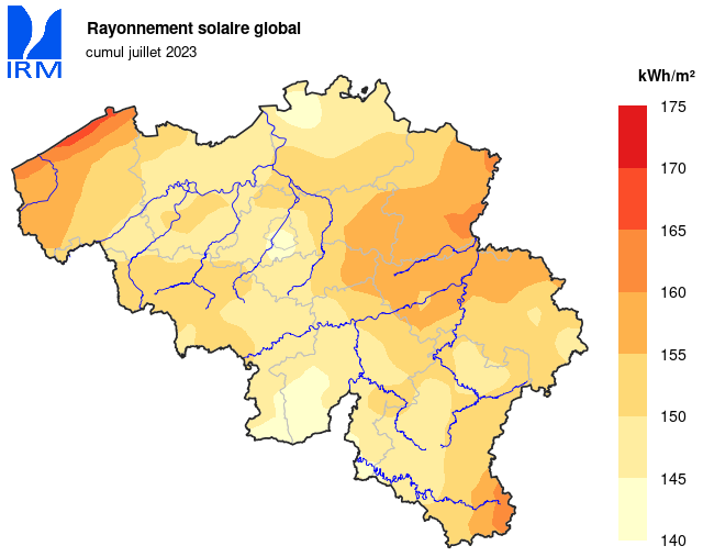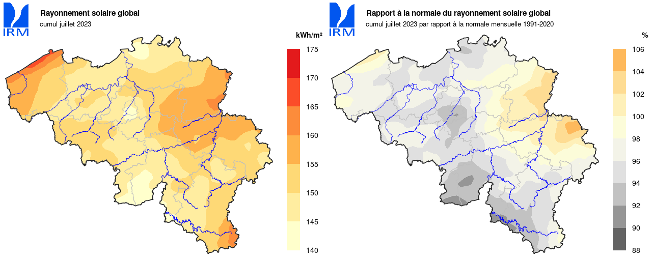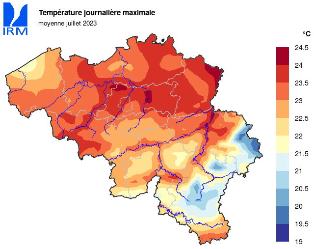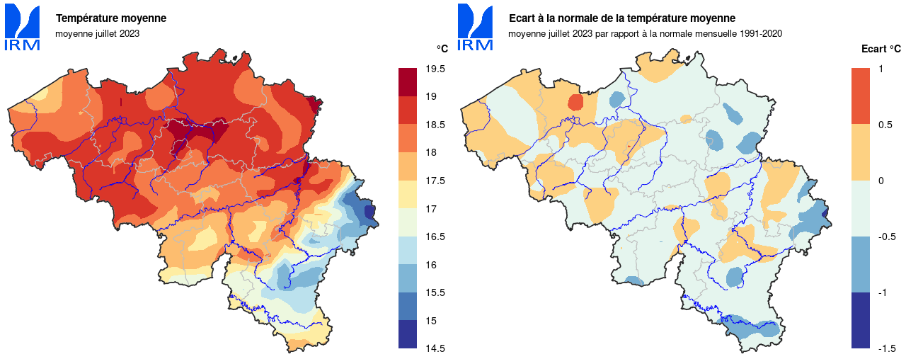 À Uccle, les températures ont varié entre 10,7°C (18 juillet) et 32,1°C (8 juillet), deux extrêmes à peine plus élevés qu'en juin dernier (10,3°C et 31,2°C).