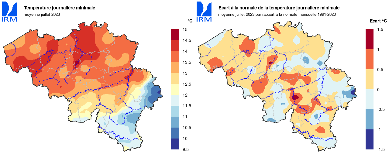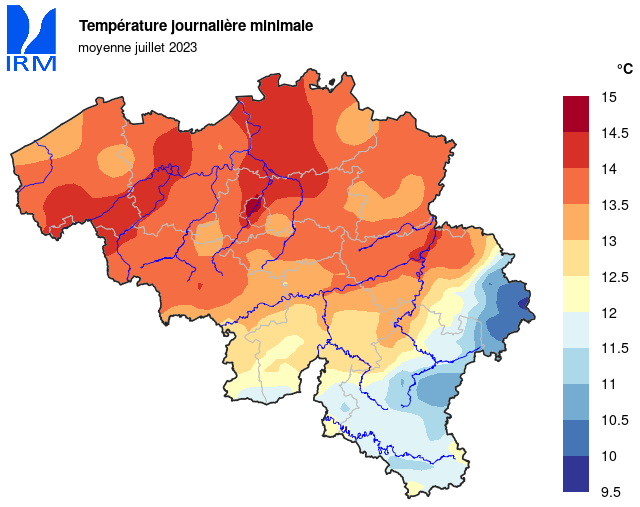 Sur l’ensemble de notre territoire, la température minimale la plus basse a été enregistrée le 22 juillet à Saint-Vith avec 3,8°C. Et la température la plus élevée a été enregistrée le 8 juillet à Westmalle (Malle) avec 34,4°C.