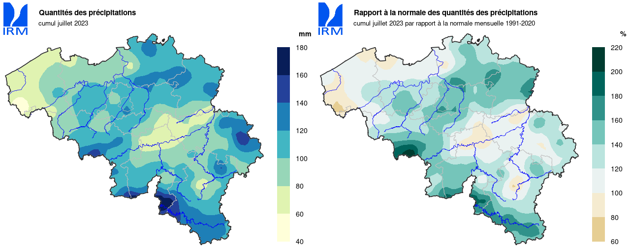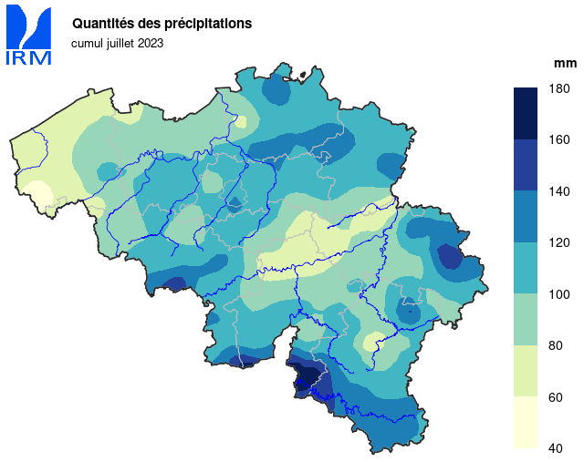 Sur l’ensemble du réseau climatologique de l’IRM, le total journalier le plus élevé a été enregistré le 31 juillet à Vresse-sur-Semois (58,7 mm).