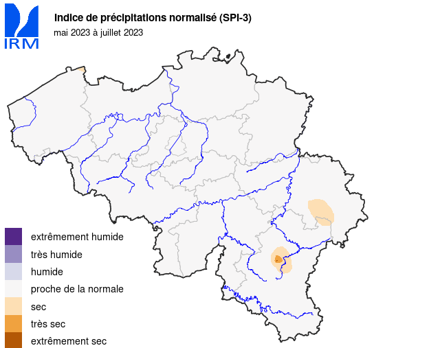 Sur l’ensemble de notre territoire, les précipitations les plus faibles sont tombées à la côte (environ 100% de la normale) et les précipitations les plus importantes sont tombées dans le Borinage (environ 165% de la normale).
