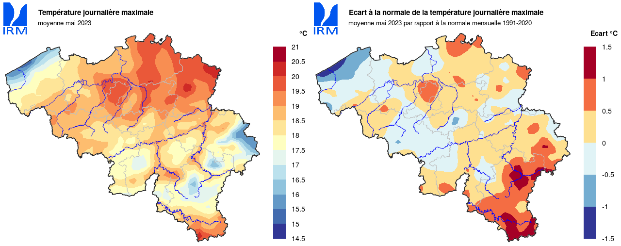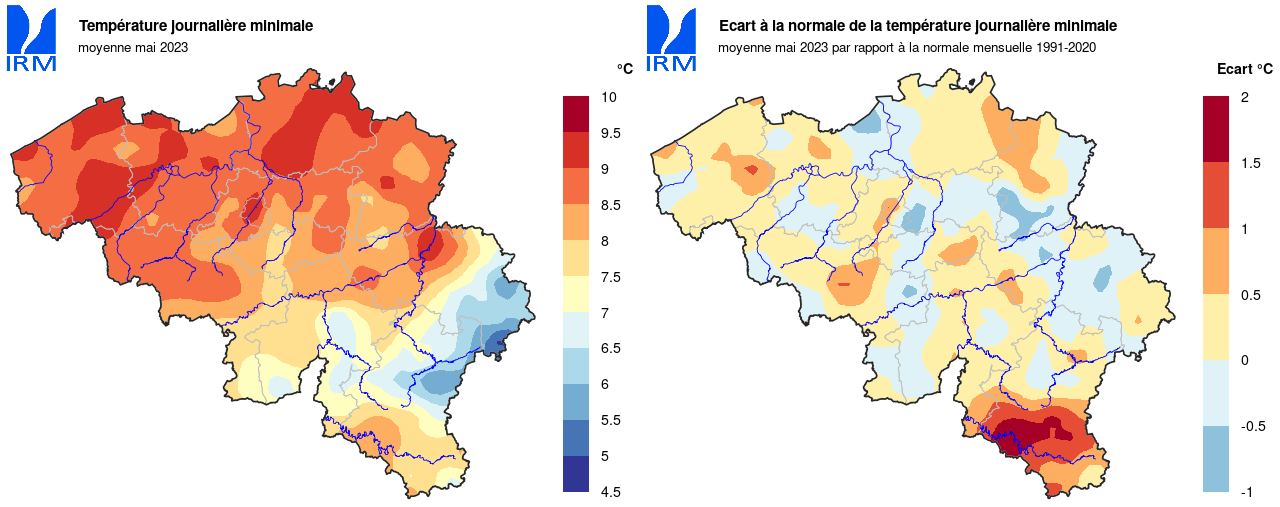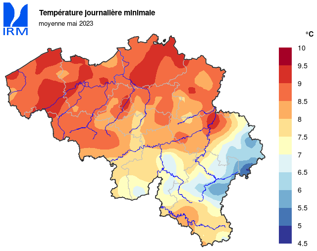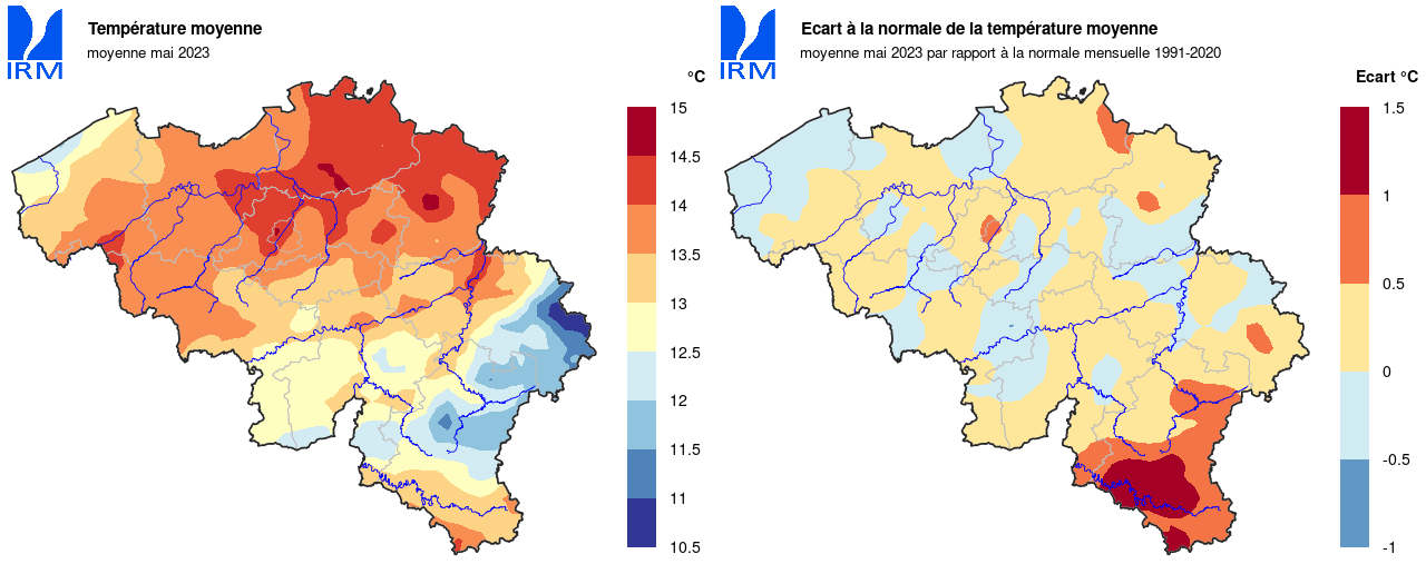 Sur l’ensemble du territoire, la température minimale la plus basse a été relevée le 3 mai à Elsenborn (Bütgenbach) avec -3,1°C. La température la plus élevée a été enregistrée le 31 à Kapelle-op-den-Bos avec 26,7°C.