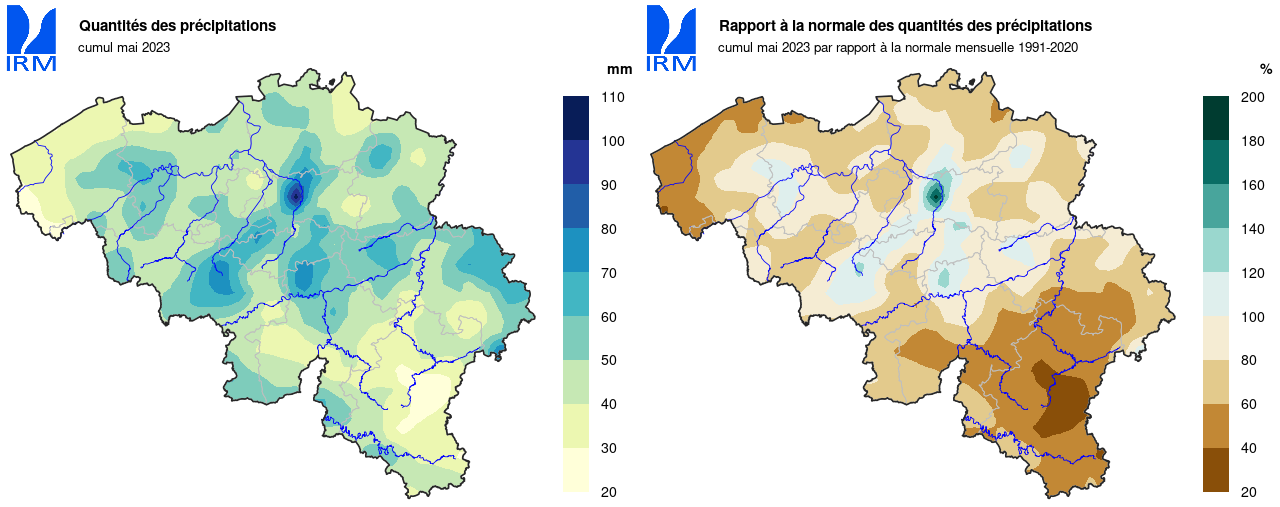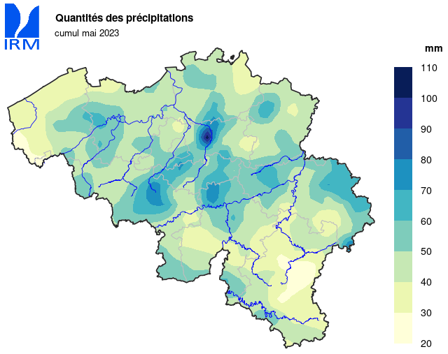 Le maximum des totaux journaliers a été enregistré le 11 mai à Herent (75,6 mm). La plupart de ces précipitations sont tombées durant les orages qui ont traversé cette région.
