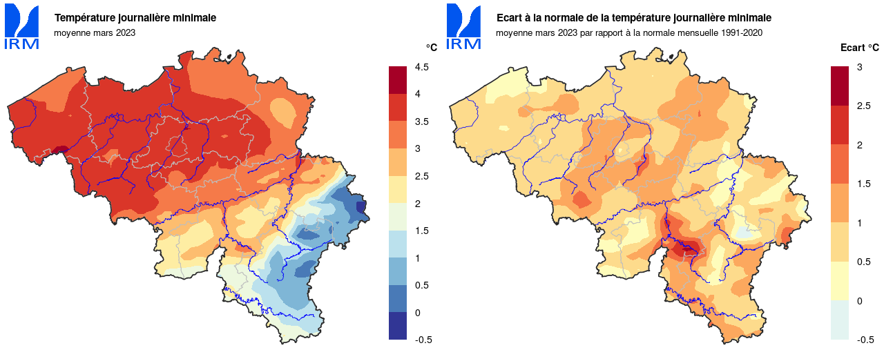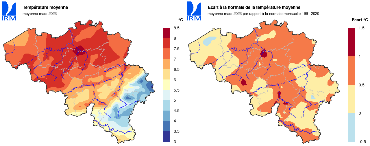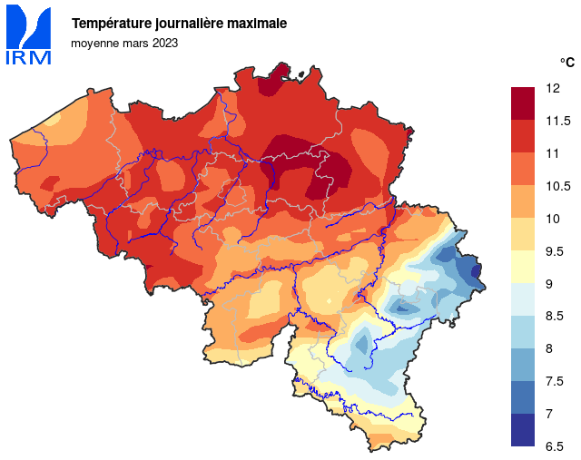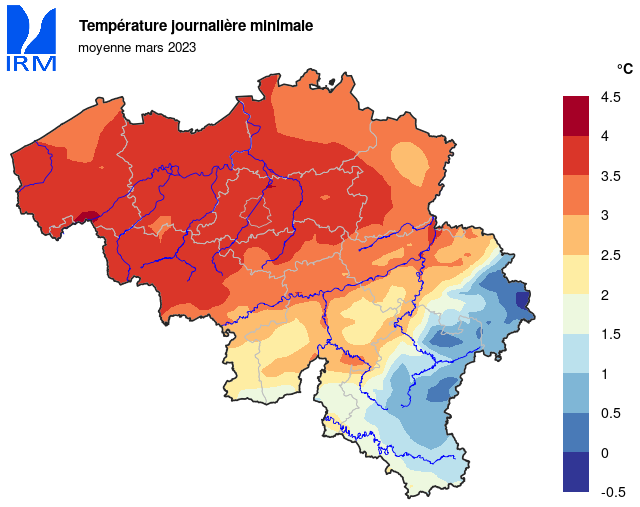 Sur l’ensemble du territoire, la température minimale la plus basse a été relevée le 1er mars à Neidingen (Saint-Vith) avec -9,8°C. La température la plus élevée a été relevée le 17 mars à Kapelle-op-den-Bos où la température a atteint 19,8°C.