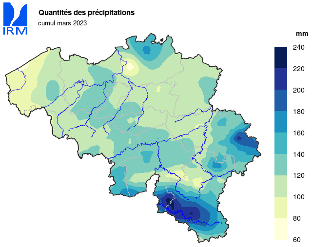 Le plus grand total journalier a été relevé à Chéoux (Rendeux) le 8 mars (36,5 mm).