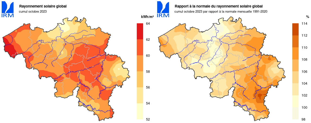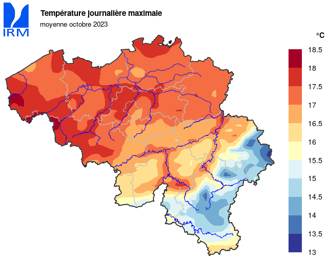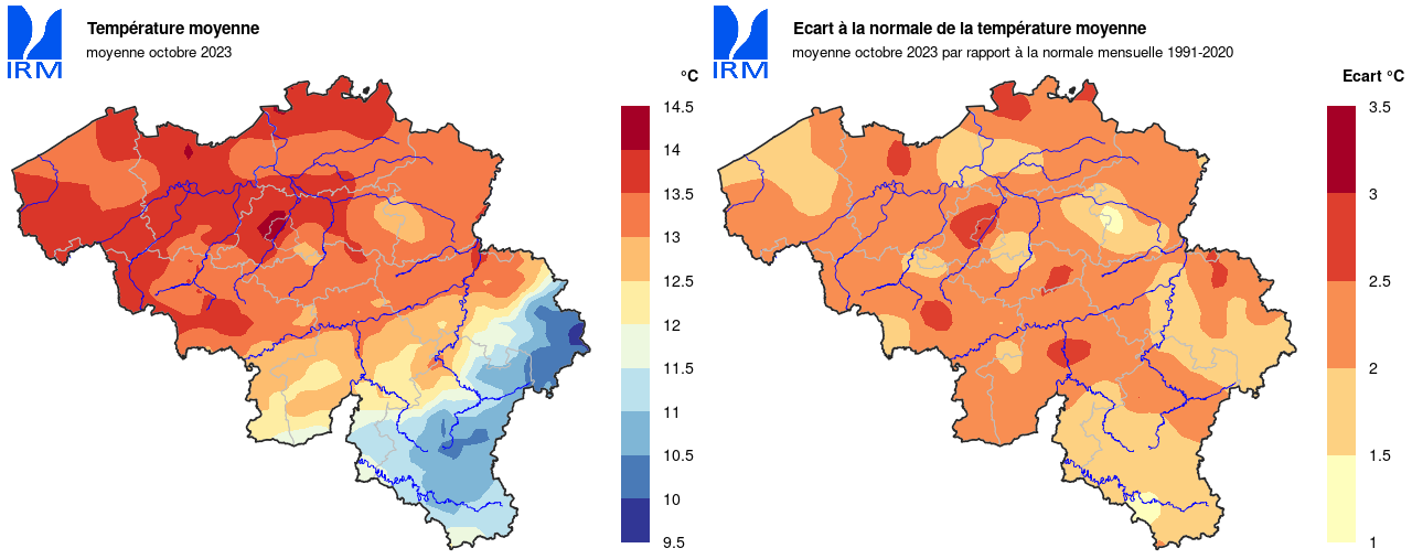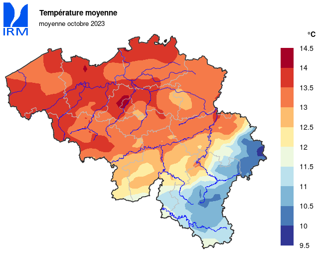 Le mois d'octobre a commencé comme le mois de septembre s'est terminé : avec des températures élevées pour cette période de l'année. Il en a été ainsi jusqu'au 13 du mois. Ensuite, les températures ont oscillé autour de la normale. Au final, la température moyenne d'octobre 2023 a été de 13,6°C (normale : 11,3°C), ce qui la place juste en dehors des cinq mois d'octobre les plus chauds pour la période de référence actuelle.