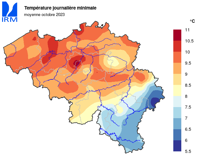 Sur l’ensemble du territoire, la température minimale la plus basse a été enregistrée le 16 octobre à Elsenborn (Bütgenbach) avec -3,4°C et la température maximale la plus élevée le 2 octobre à Kapelle-op-den-Bos avec 27,5°C.
