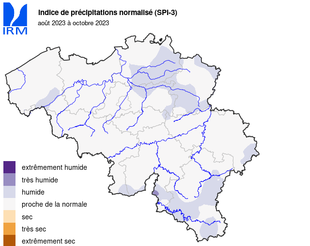 Sur l’ensemble du territoire, les précipitations les plus faibles sont tombées dans le Condroz (environ 115 % de la normale) et les plus importantes en Campine (environ 185 % de la normale).