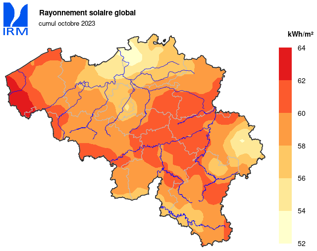 Pour ce paramètre également, il y a eu une grande différence entre le début et la fin du mois. La première décade (1-10 octobre) a été la deuxième plus ensoleillée pour la période de référence actuelle. Pendant ces 10 jours, le soleil a brillé 61h 35min à Uccle (normale : 35h 49min). Le record reste celui de 2018 (80h 07min).