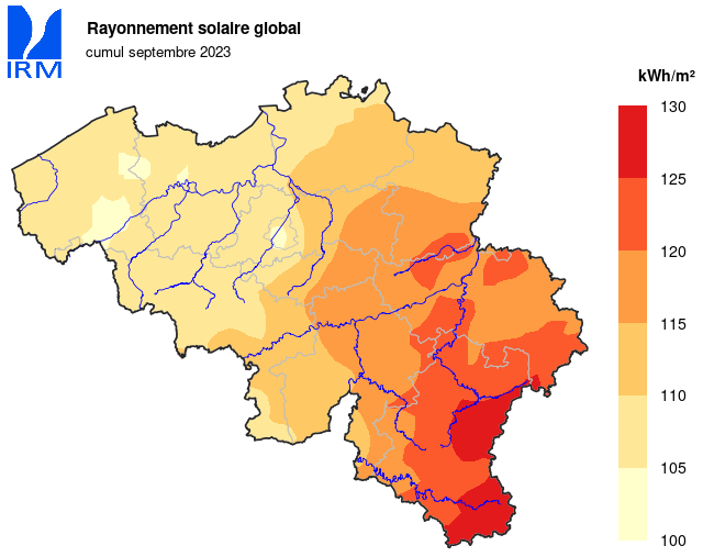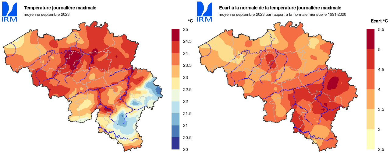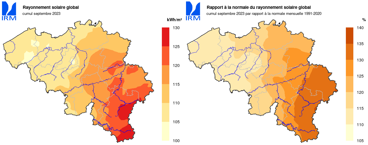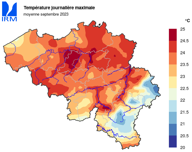 À Uccle, les températures ont varié entre 7,9°C (24 septembre) et 31,9°C (10 septembre). Cette dernière valeur est la troisième plus élevée de septembre depuis le début des observations en 1892. Le record reste celui de 2020 (34,3°C) et nous avons également pu enregistrer une journée de septembre plus chaude en 1929 (32,8°C).