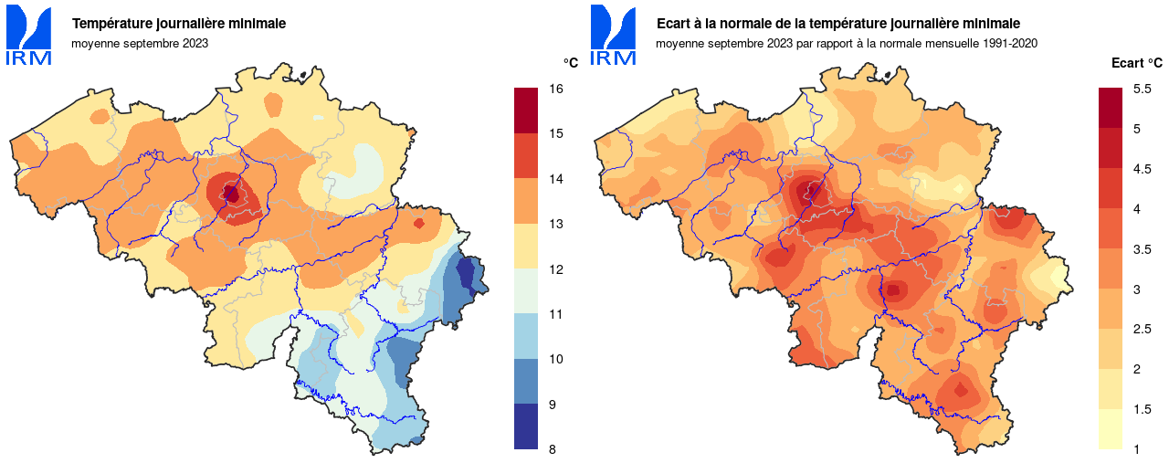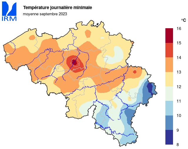 Sur l’ensemble de notre territoire, la température minimale la plus basse a été enregistrée le 24 septembre à Elsenborn (Bütgenbach) avec 0,3°C. La température la plus élevée a été enregistrée le 9 septembre à Zulzeke (Kluisbergen) avec 33,8°C.