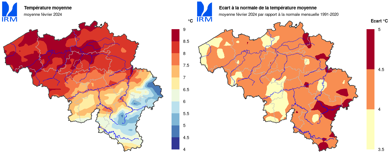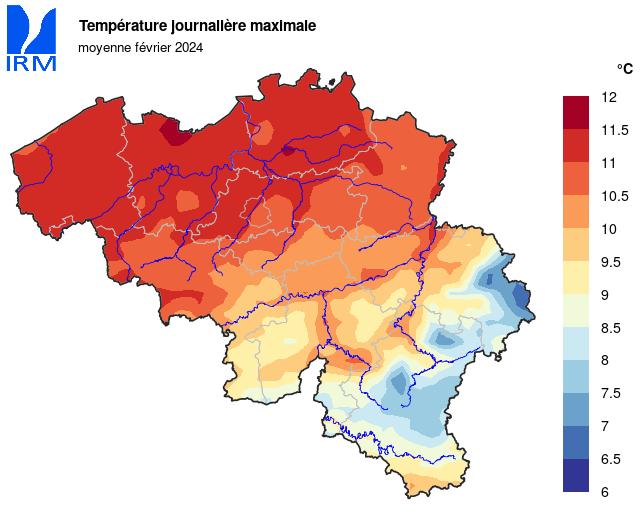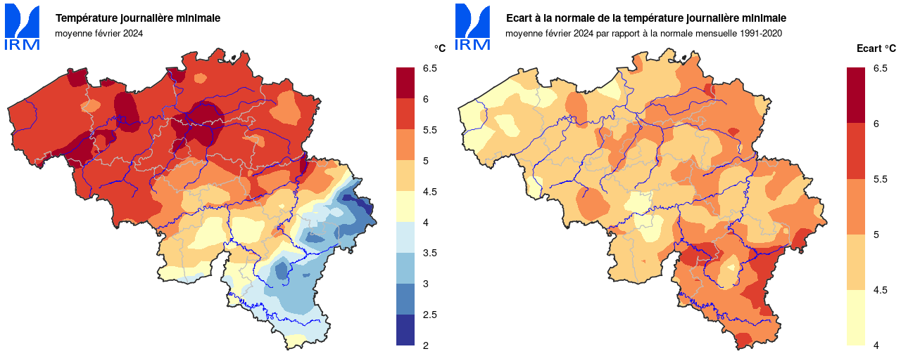 Sur l’ensemble de notre territoire, la température minimale la plus basse a été mesurée le 28 février à Elsenborn (Bütgenbach) avec -5,1°C. Depuis le début de notre réseau climatologique national en 1954, ce n'est que le sixième mois de février où cette valeur a été supérieure à -6°C.